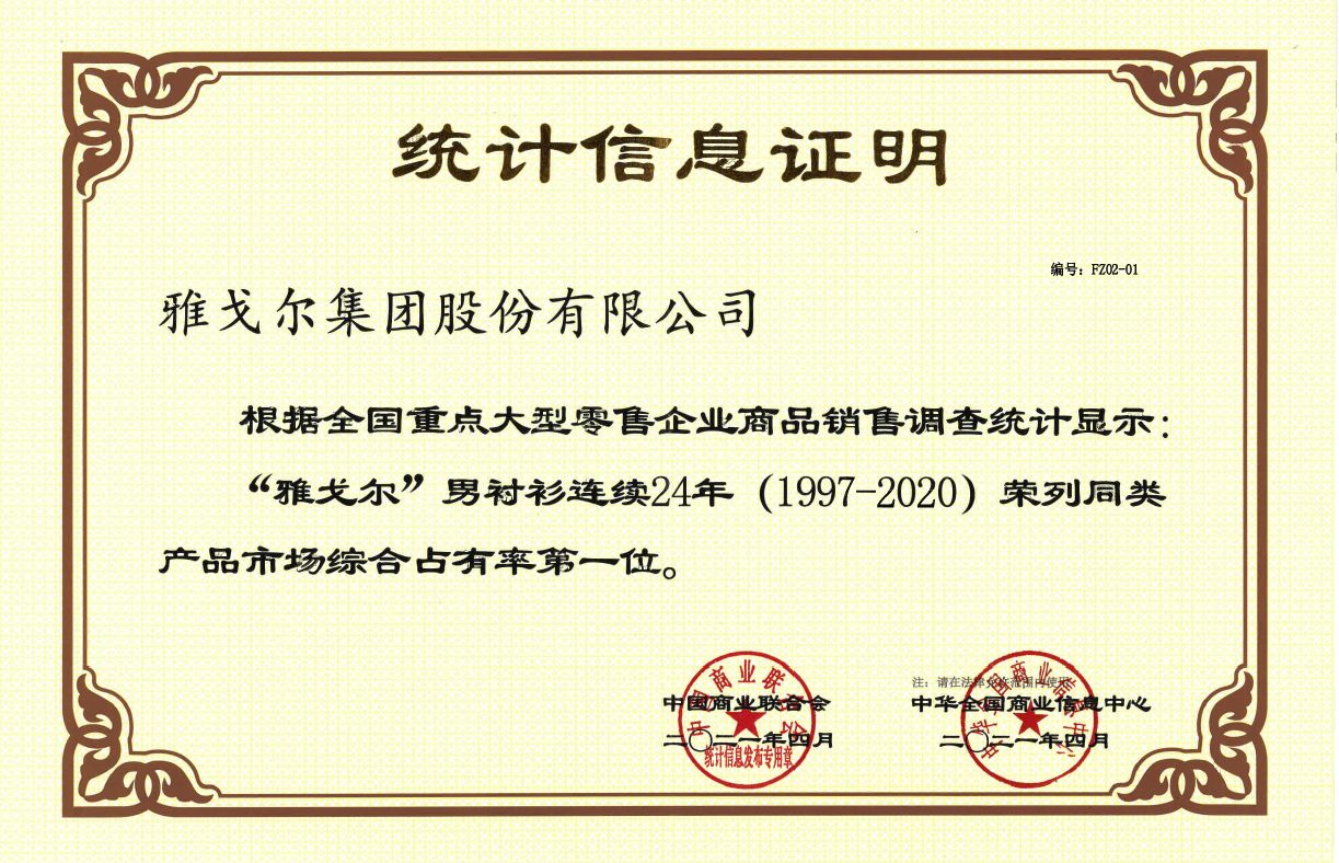 • 雅戈尔男衬衫连续24年、男西装连续21年获得全国市场综合占有率第一