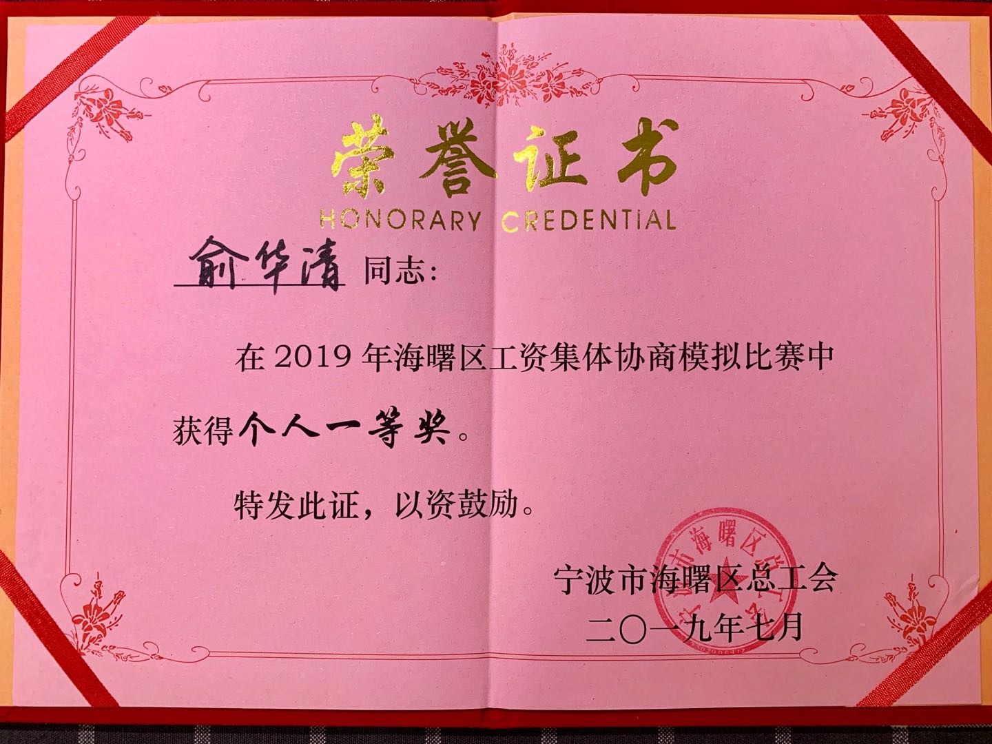 2019年7月30日上午海曙区总工会在章水镇举办“海曙区工资集体协商模拟赛暨宁波市集体协商模拟赛观摩会”。各镇(乡)、街道总工会组成8支参赛队伍参加此次竟赛。雅戈尔集团工会代表俞华清参加竞赛,荣获集体一等奖,个人一等奖的好成绩。