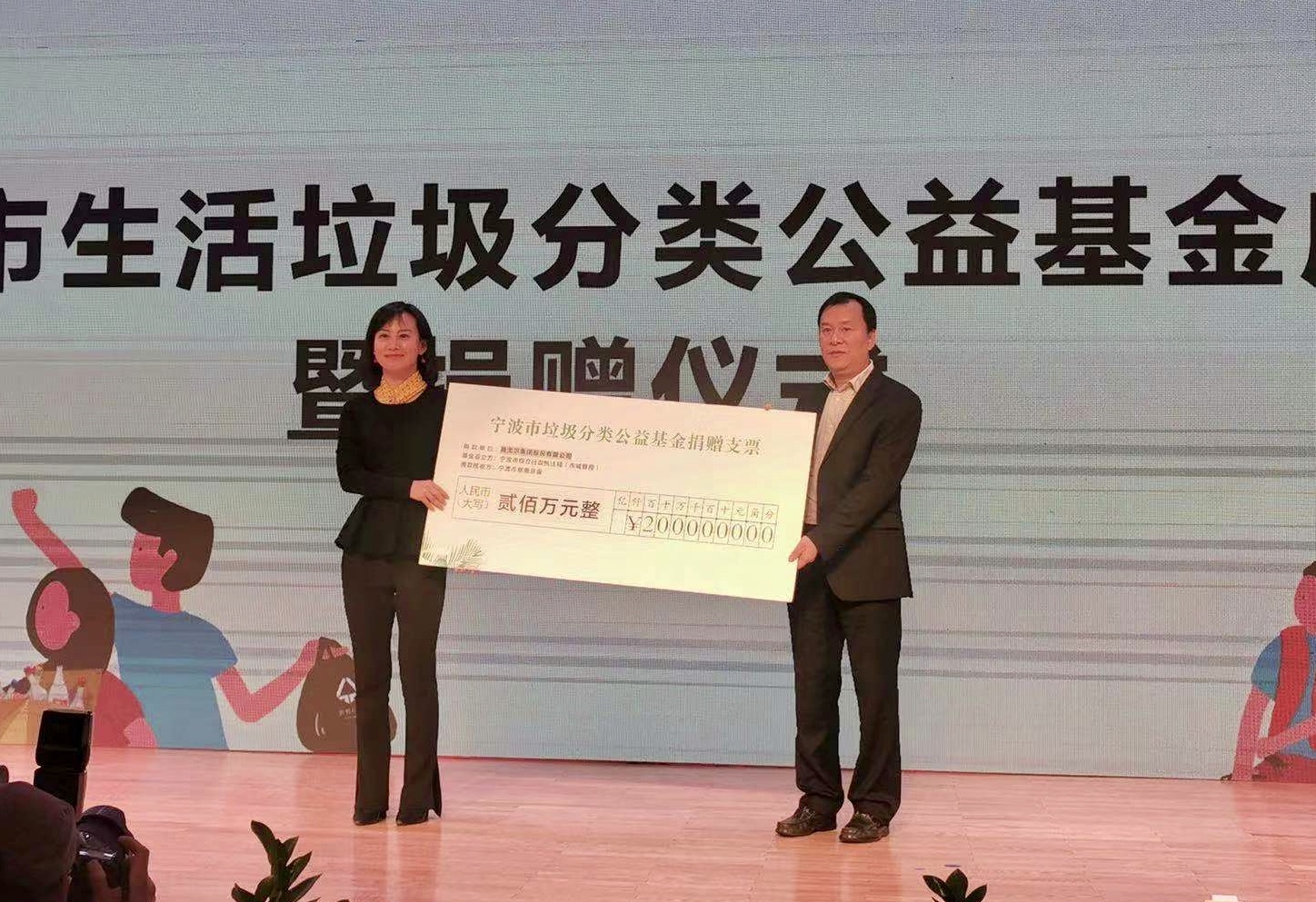 12月21日,在宁波市垃圾分类全民行动日启动仪式上,宁波成立全国首个垃圾分类公益基金,雅戈尔集团股份有限公司现场捐赠200万。