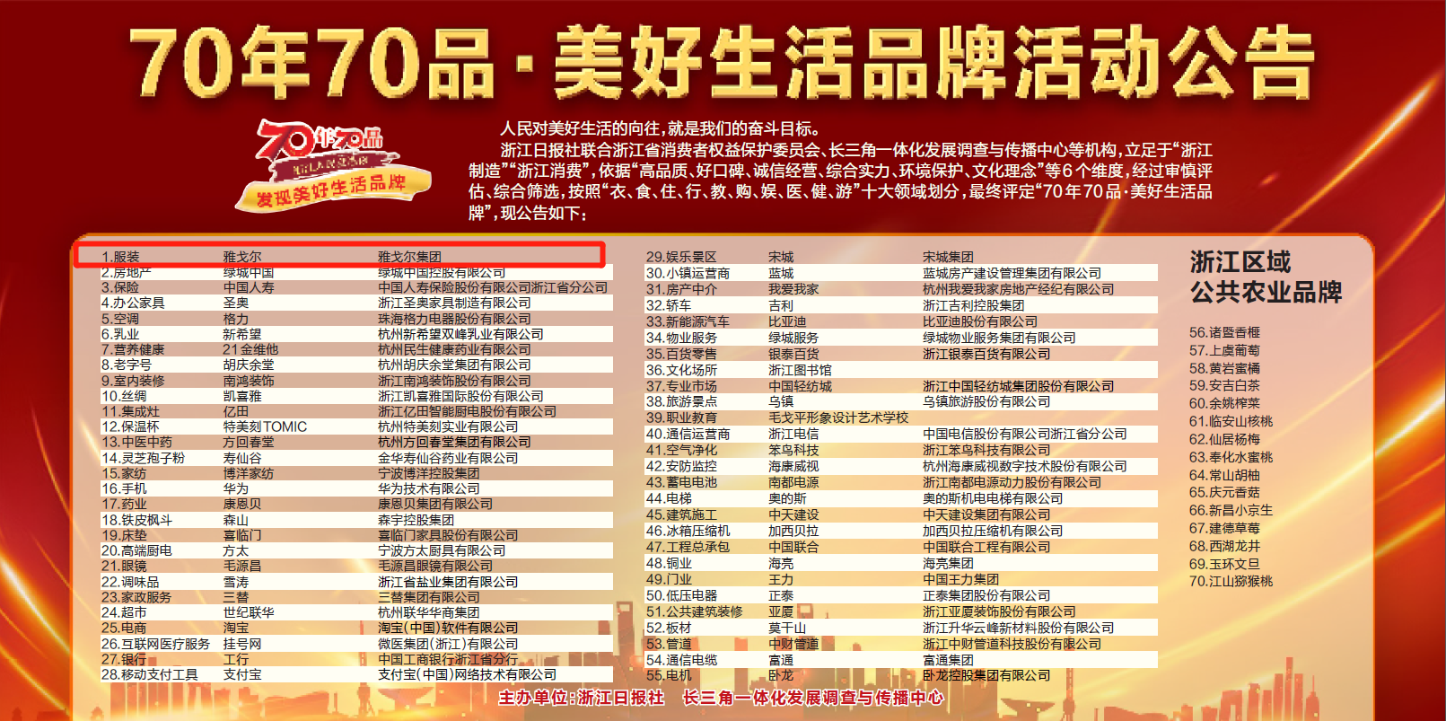 3月5日,浙江日报社联合浙江省消费者权益保护委员会、长三角一体化发展调查与传播中心等机构,发布”70年70品·美好生活品牌”活动公告,雅戈尔品牌入选服装类美好生活品牌。